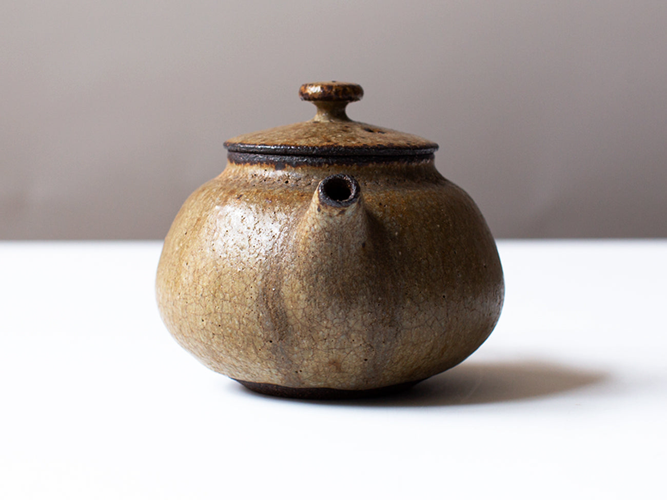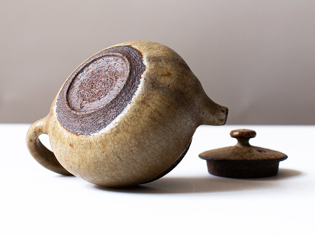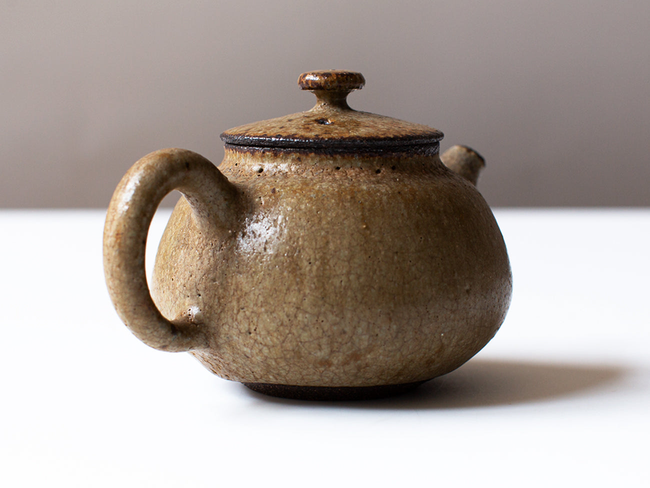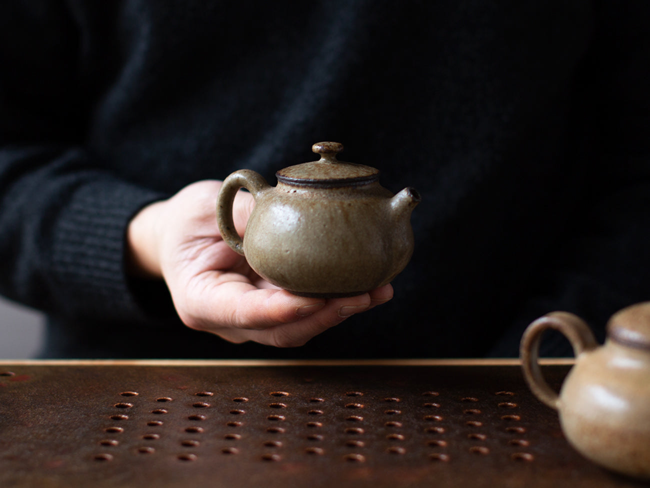 Zhang Hao Yen’s latest collection of tiny teapots are perfectly proportioned for this style of tea making. Thrown from dark stoneware clay, the artist achieves the same qualities of wood fired ceramics on the exterior of this piece by mixing ash into his glaze. You can find evidence of this in the organic striations and light crazing on the surface of the form, keeping the eye roving across this this classically proportioned pot. The interior of the vessel in unglazed, yet remains fully water tight and non-porous due to its high firing temperature in a gas kiln.