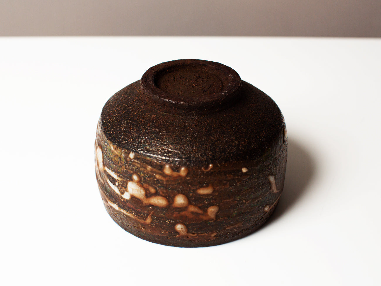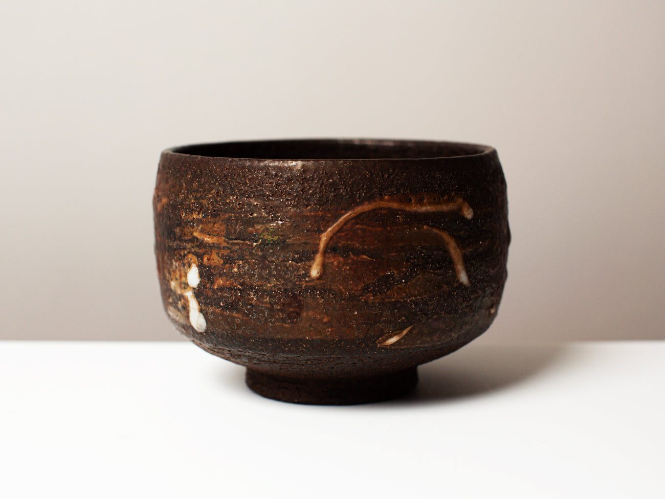 This tea bowl from ceramicist Zhang Yun Cheng is thrown with a textured stoneware and fired in a wood-burning kiln for five days. The atmospheric patterns of ash and carbon as they move through the kiln enhance the rusticity of the bowl’s texture, drawing out grog and flecks of iron oxide in the clay and elevating these tactile elements to the surface of the form. A light banding of brushed and drizzled shino glaze adds to this texture, and visually creates an aura of rotational movement to the form. This piece received extra attention from the artist, who pre-seasoned the bowl with tea for over a week, creating a subtle iridescence that will continue to develop with time and use.