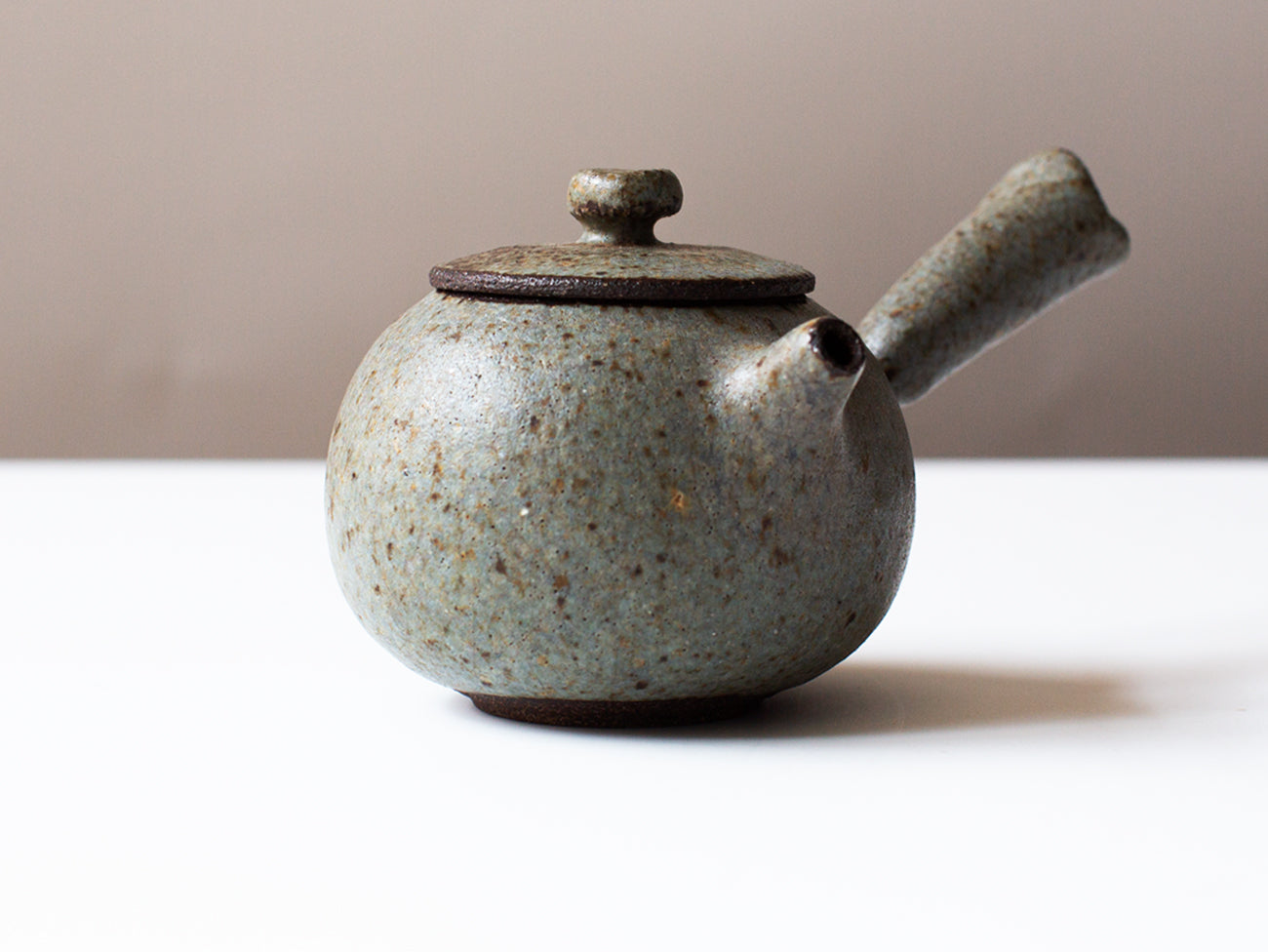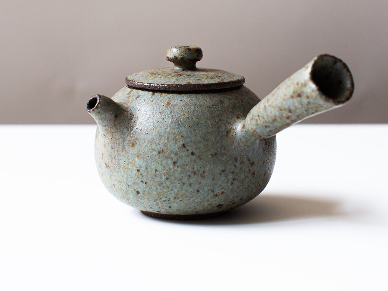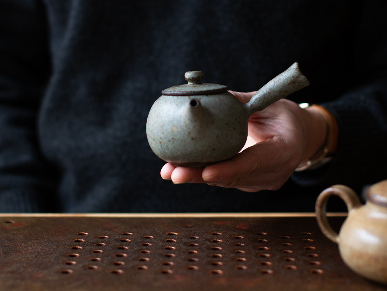 Zhang Hao Yen’s latest collection is perfectly proportioned for this style of tea making. Thrown from dark stoneware clay this little kyusu features a hand built handle, intended for right-handed brewing. The glaze moves back and forth between cream and robin's egg blue, offset with specks of iron that freckle the surface of the form.