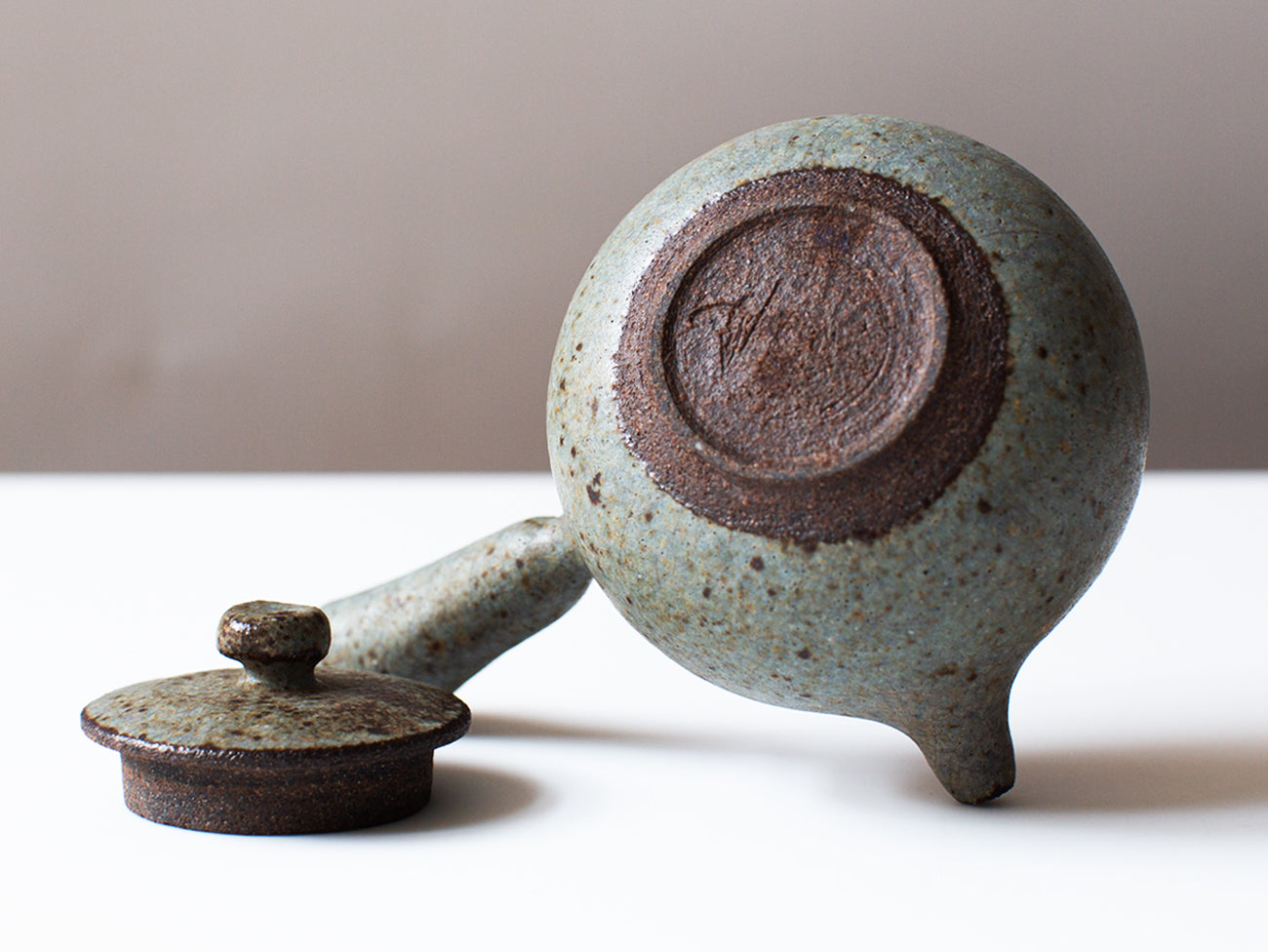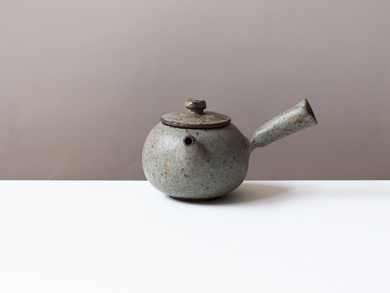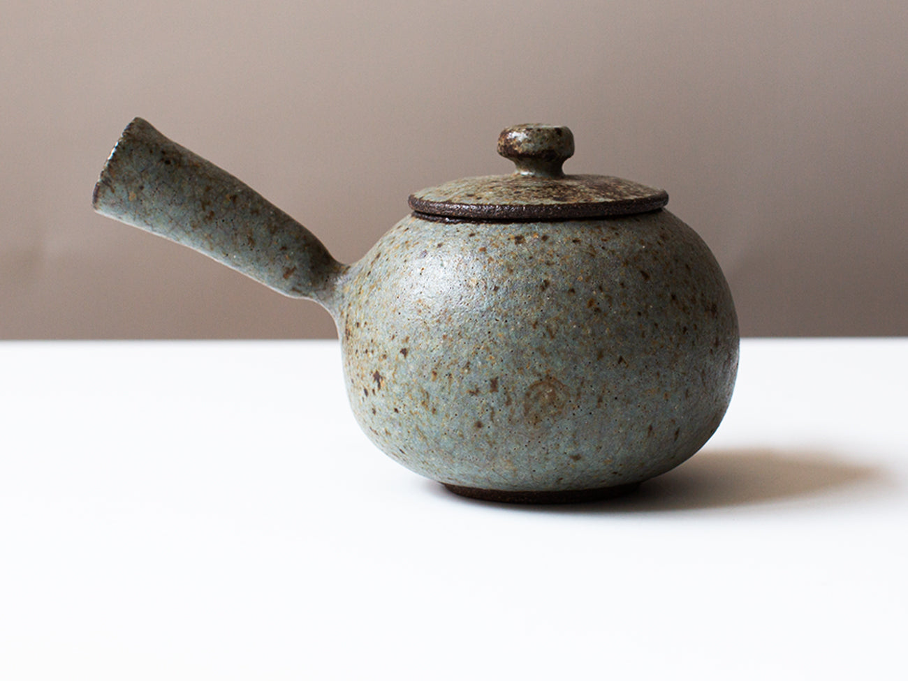 Zhang Hao Yen’s latest collection is perfectly proportioned for this style of tea making. Thrown from dark stoneware clay this little kyusu features a hand built handle, intended for right-handed brewing. The glaze moves back and forth between cream and robin's egg blue, offset with specks of iron that freckle the surface of the form.