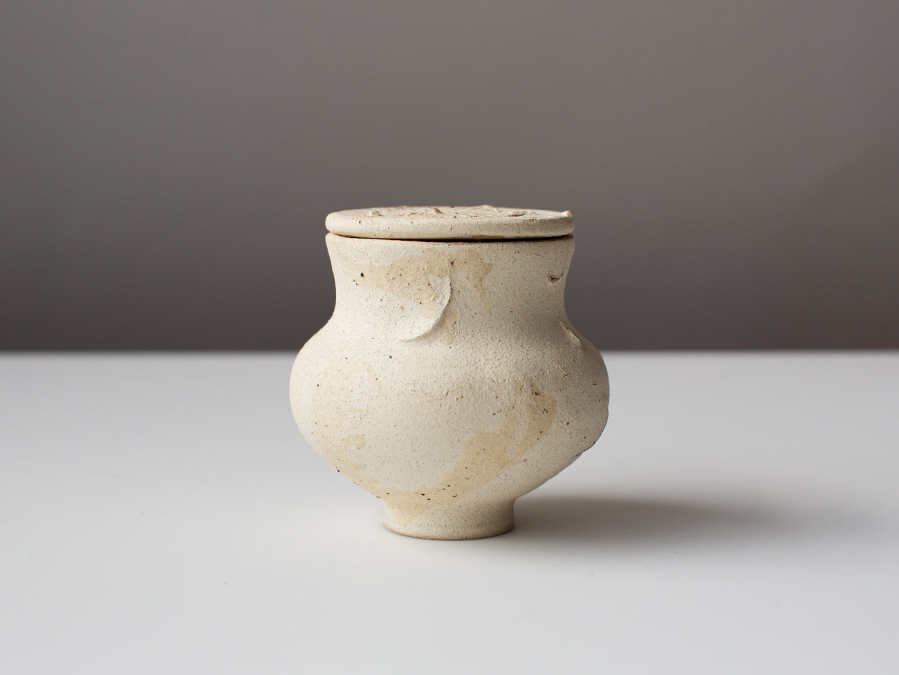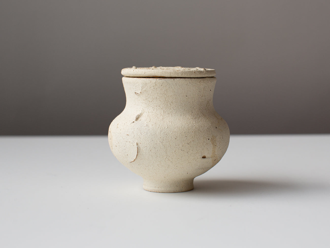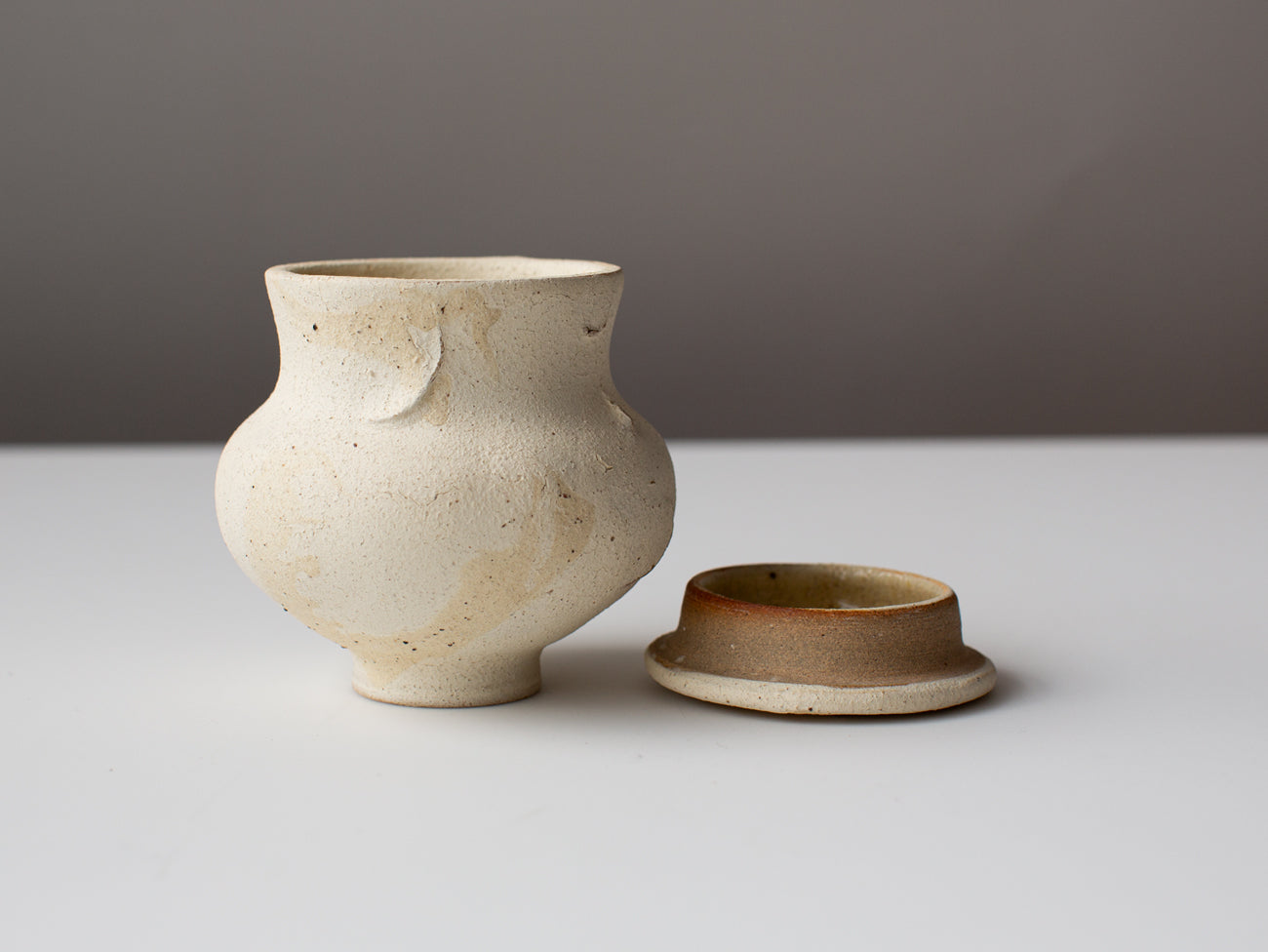 Tea caddies feature very sparsely in our collection, yet we couldn’t resist the character and charm of Chia’s petite jars; a most delightful accompaniment to the artist’s collection of teapots, servers, and water bowls. The exterior of each vessel is brushed in a tactile layer of engobe, the clay-rich slurry that lends the piece it’s meringue-like texture. Inside, the vessel features a light layer of glaze that pulls freckles of iron spotting to the surface of the clay like beauty marks.