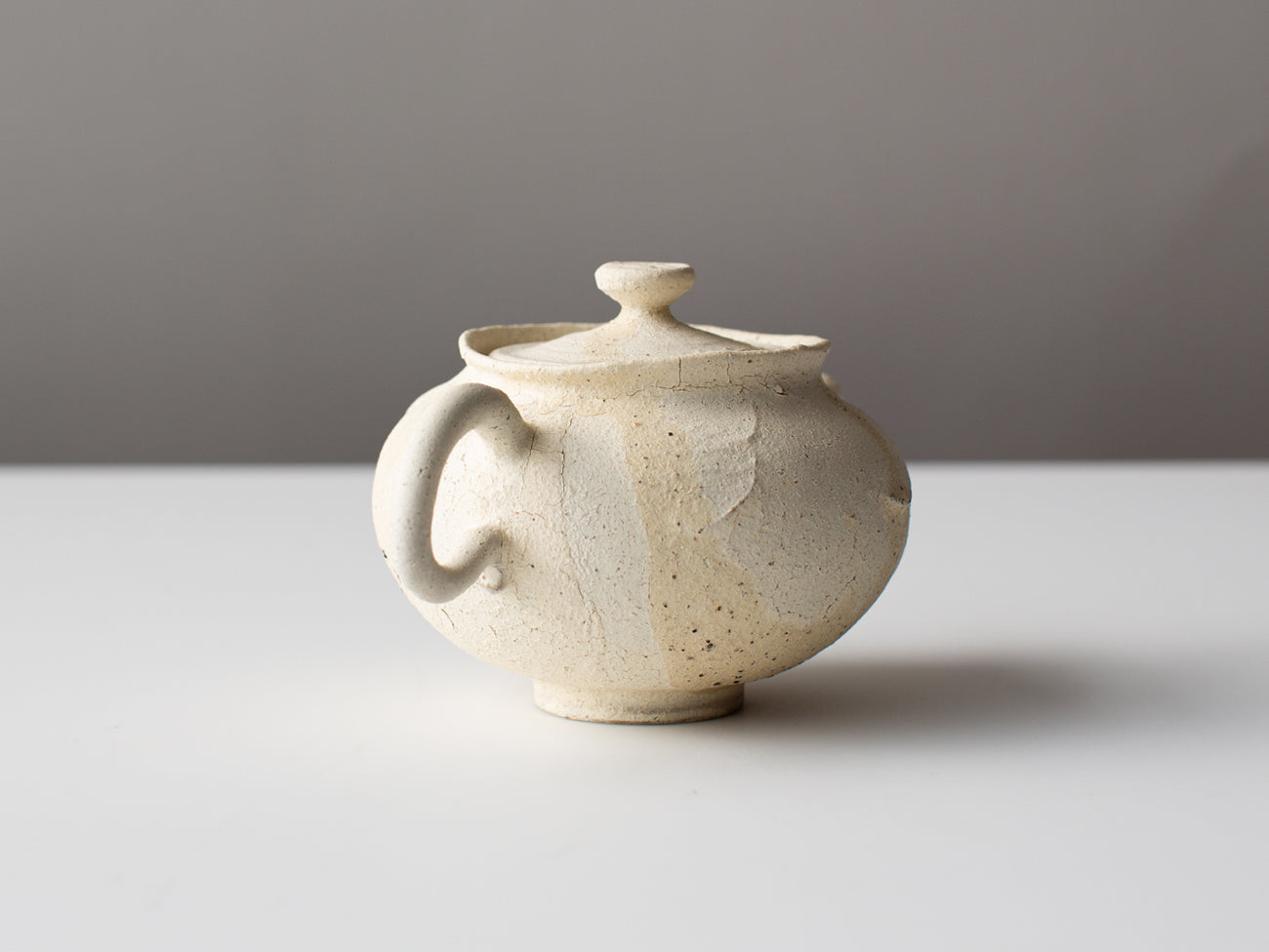 Covered in a thick layer of matte engobe, a high clay slurry similar to slip, the exterior of the pot shows hairline crazing and intermittent iron freckles, like a baked meringue fresh from the oven, a striking contrast to the elegantly shaped elements of body, lid, and handle. Inside, the vessel is fully glazed, ensuring a water tight brewing experience.