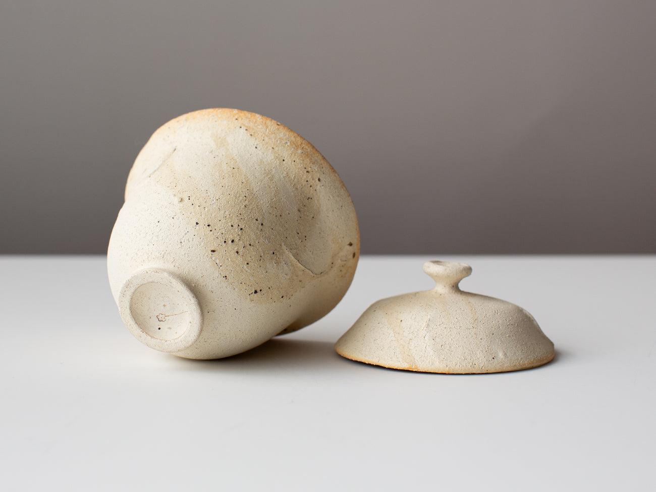 Covered in a thick layer of matte engobe, a high clay slurry similar to slip, the exterior of this tall shouldered gaiwan presents hairline crazing and intermittent iron freckles, akin the the surface of a salt lake or weathered bone, a striking contrast to the traditional form. Inside, the gaiwan is fully glazed, ensuring a water tight brewing experience.