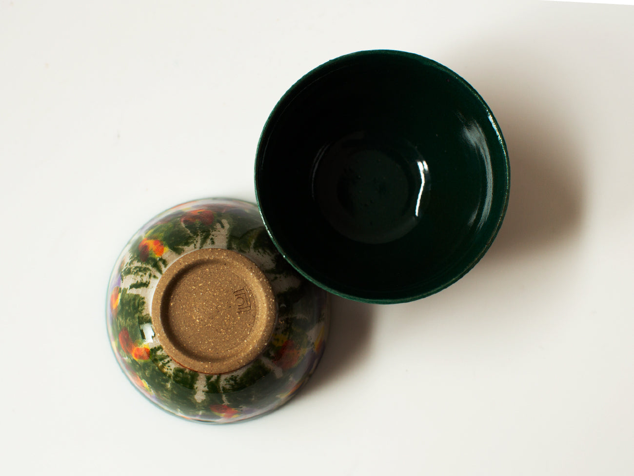 A near opaque layer of porcelain slip over stoneware clay provides a brightening backdrop to these saturated colors, complimented with a glossy forest green glaze on the interior of the gaiwan and lid. Vibrant blossoms spring to life atop strokes of dark green, unfurling like the beards and sepals of an iris. Each piece feels like a celebration of winter colors, offering a cheering start to any tea brewing session