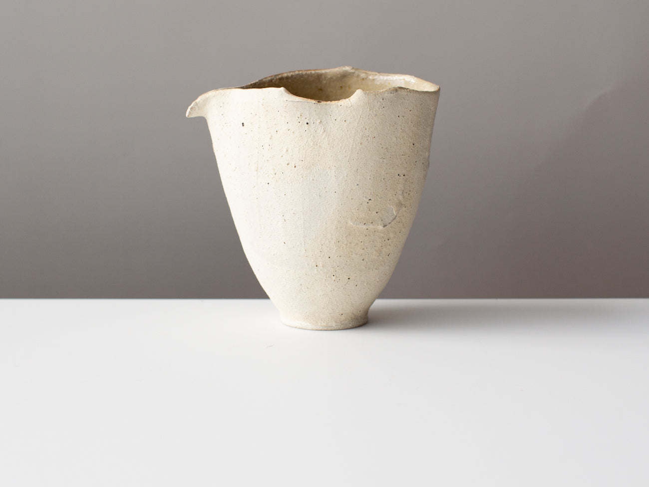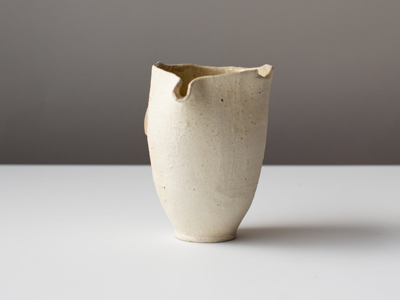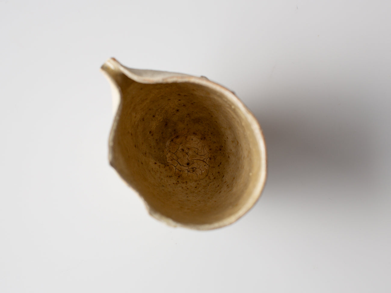 Like an autumn leaf, curled and drying in the wind, the edges of this delicate tea server seem to fold in on themselves organically, with nary a finger of human intervention. The artists choice of matte engobe and interior glaze serve to reiterate this phenomenon, natural textures that crackle with the crispness of fall. These qualities are belied only in the servers functionality, each pour testament to Chia’s hand, with a steady, clean pour from server to waiting cup.