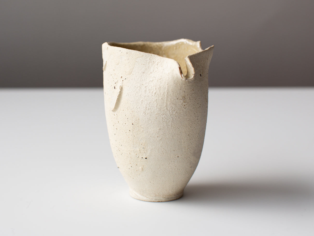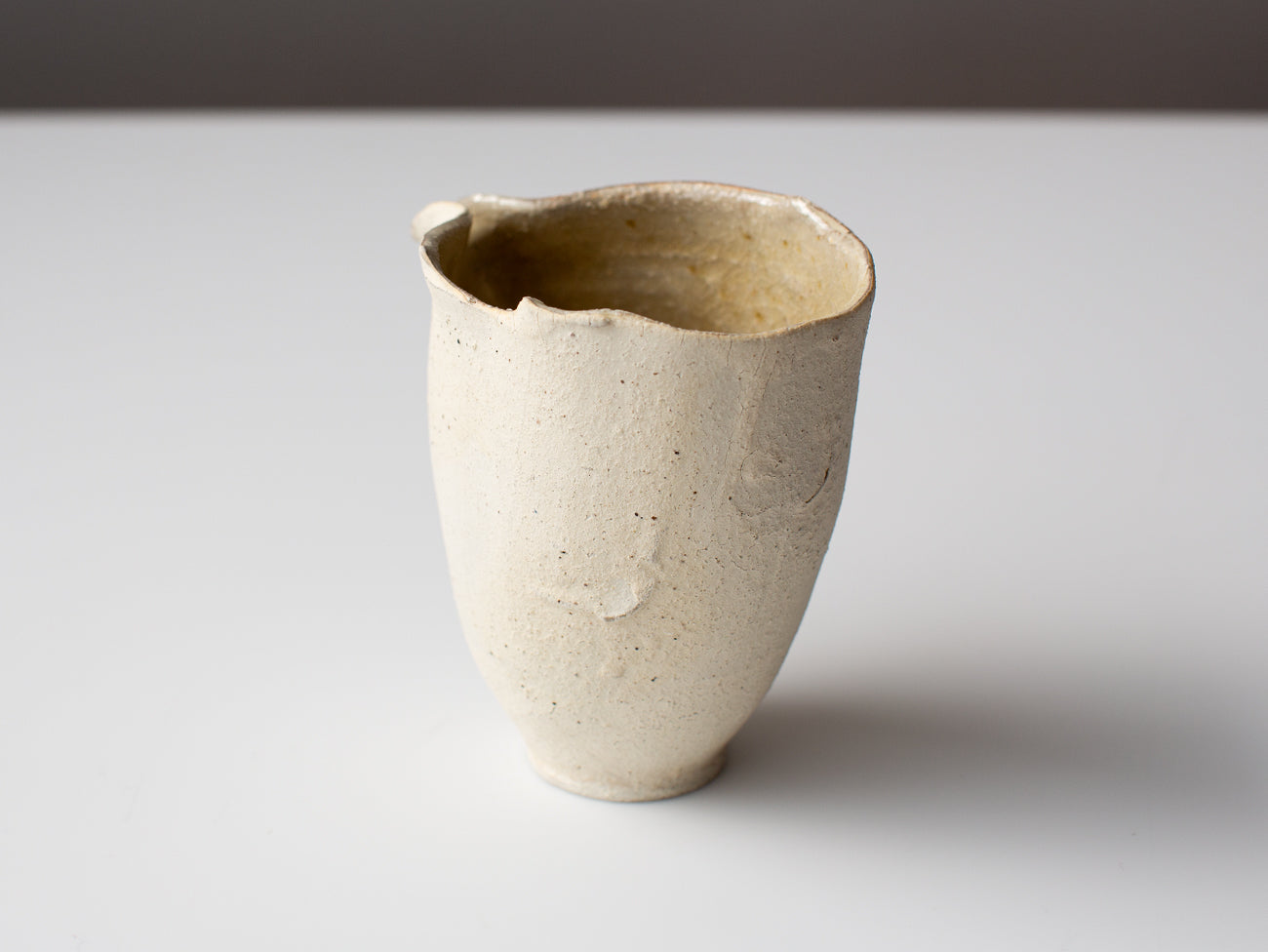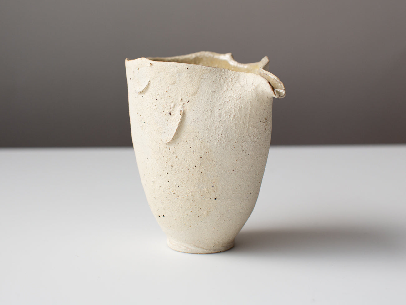 Like an autumn leaf, curled and drying in the wind, the edges of this delicate tea server seem to fold in on themselves organically, with nary a finger of human intervention. The artists choice of matte engobe and interior glaze serve to reiterate this phenomenon, natural textures that crackle with the crispness of fall. These qualities are belied only in the servers functionality, each pour testament to Chia’s hand, with a steady, clean pour from server to waiting cup.