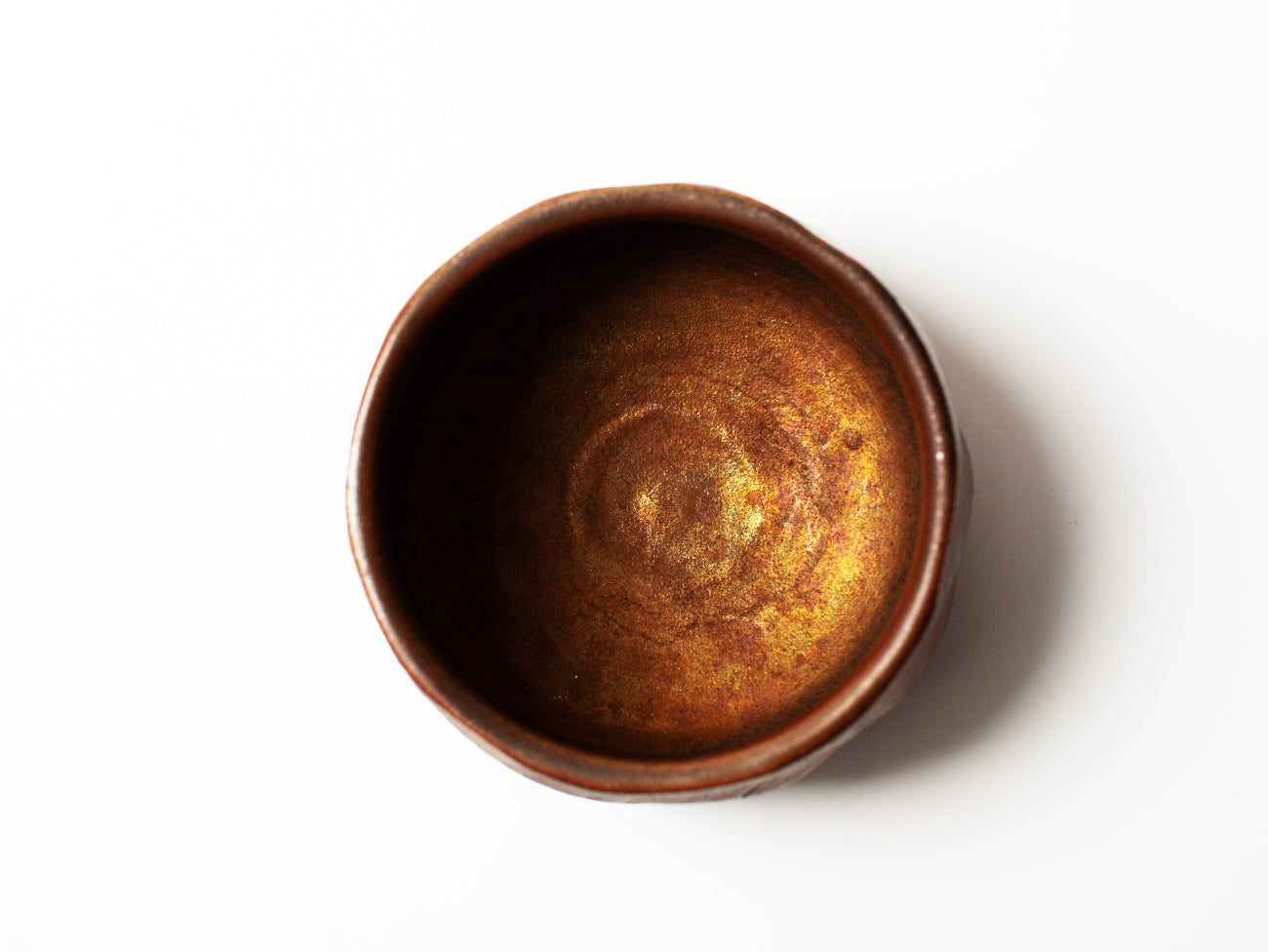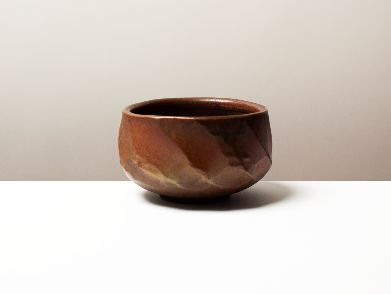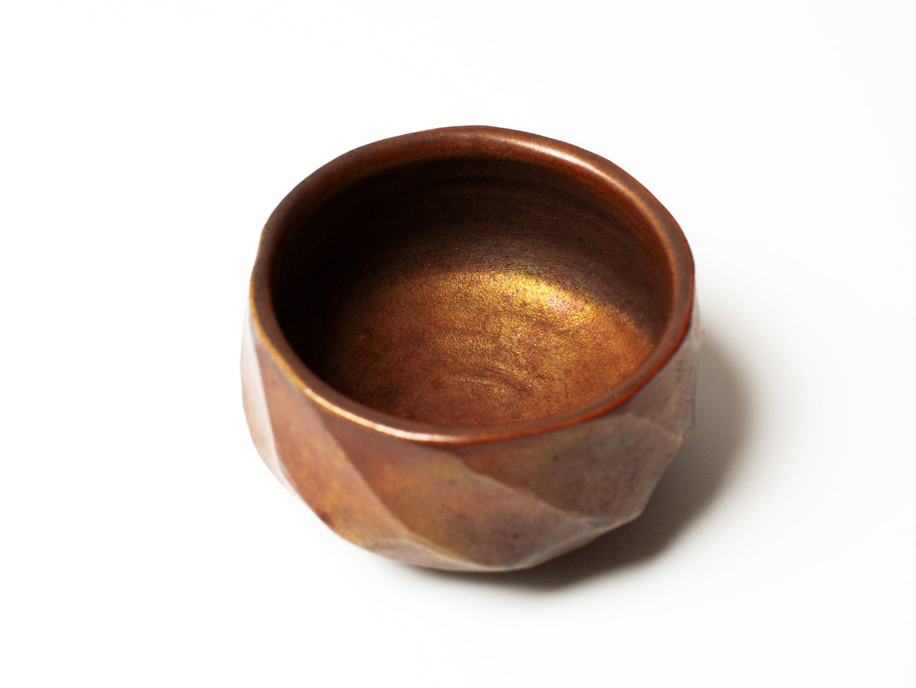 This tea bowl from ceramicist Zhang Yun Cheng is thrown with a textured stoneware and fired in a wood-burning kiln for five days. The atmospheric patterns of ash and carbon as they move through the kiln enhance the rusticity of the bowl’s texture, burnishing the surface with warm tones of copper and bronze, further distinguished by the hand cut facets carved into the bowl after throwing. This piece received extra attention from the artist, who pre-seasoned the vessel with tea for over a week, creating a subtle iridescence that will continue to develop with time and use.