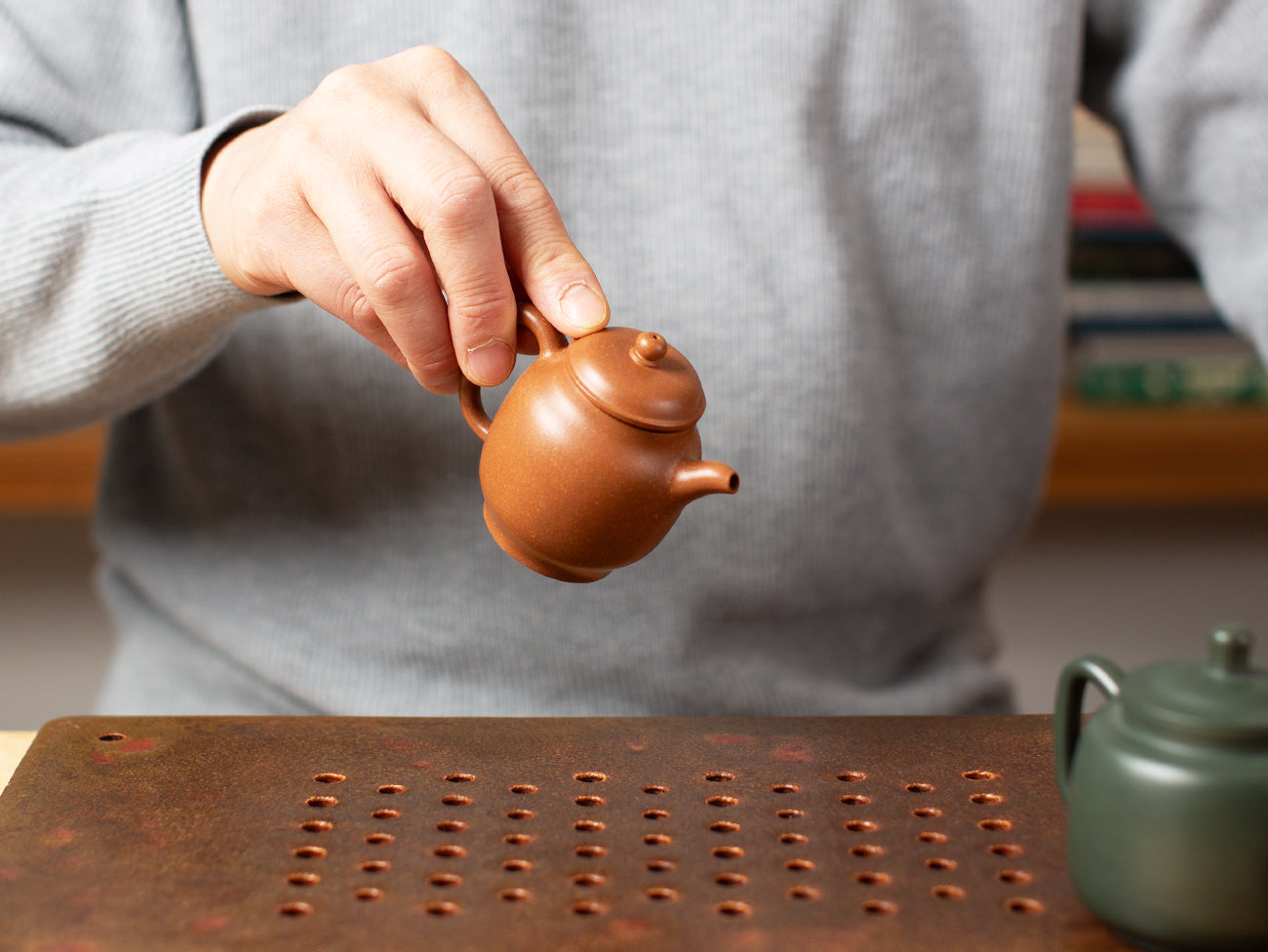 The artist sources her clay body from her family’s own safe kept slabs in Yixing, China, the epicenter of the celebrated, eponymous Yixing Pottery. The makeup of zisha remains permeable after firing, and with each steeping, the pot will begin to absorb trace amounts of the tea’s oils and character. This quality has given rise to a long tradition of dedicating one pot to just one tea type, for as the clay seasons over time, each pot takes on a singular terroir of its own.