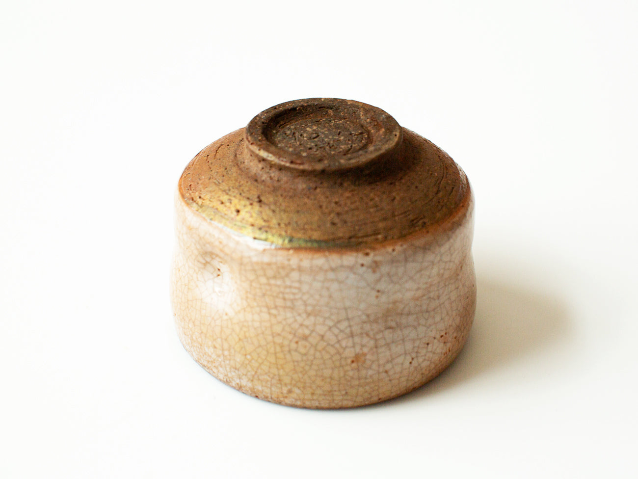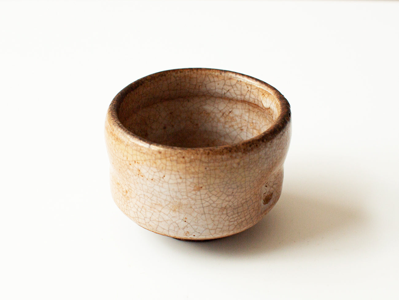 This cup from ceramicist Zhang Yun Cheng is thrown with a textured stoneware and fired in a wood-burning kiln for five days. A luminous coating of shino glaze covers this piece, the firing process drawing forth its natural penchant for crazing as seen in the tiny crackles that cover the surface of the vessel. Patterns of ash and flame can be indentified, following the course they charted through the kiln, creating areas of dark carbon trapping along the lip of the cup and enhancing the rusticity of the surface texture, drawing out grog and flecks of iron oxide in the clay and elevating tactile elements fore.