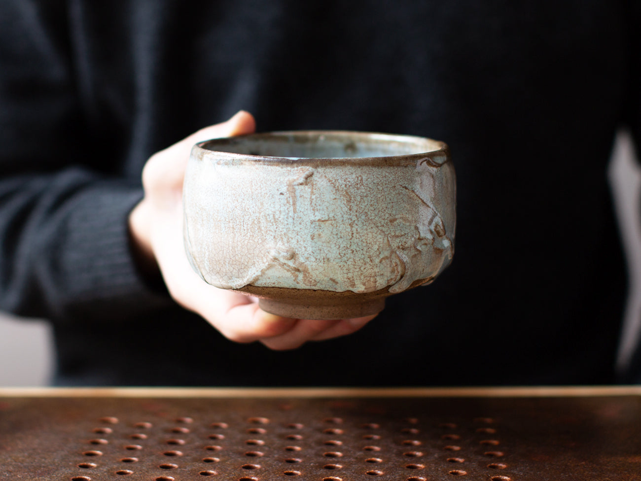 The best tea bowls for this brewing style act like extensions of the hand, vessels intended to be cradled throughout the day. Taiwanese potter, Zhang Hao Yan is a master of this form, each bowl gently curved and sized to hold close. Thrown from dark stoneware and trimmed by hand on the potter’s wheel, the surface is glazed in a stunning shade of opaque celadon blue, run through with rivulets of grey brown that break on the textured peaks of the surface like Arizona-mined Morenci turquoise.