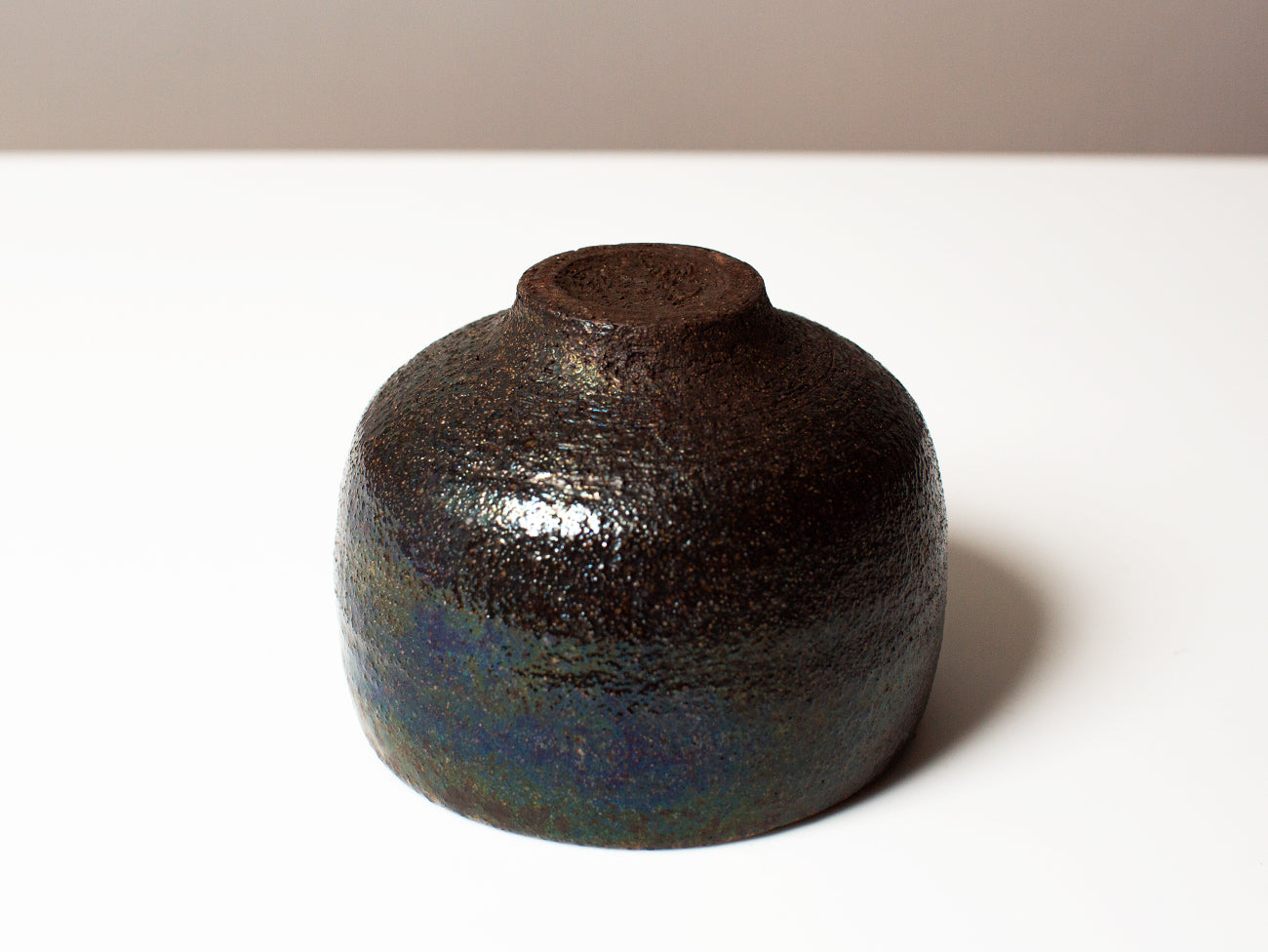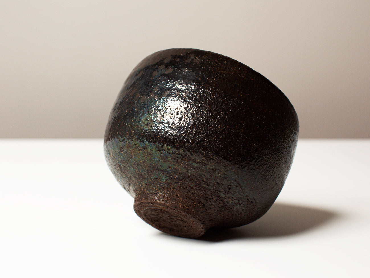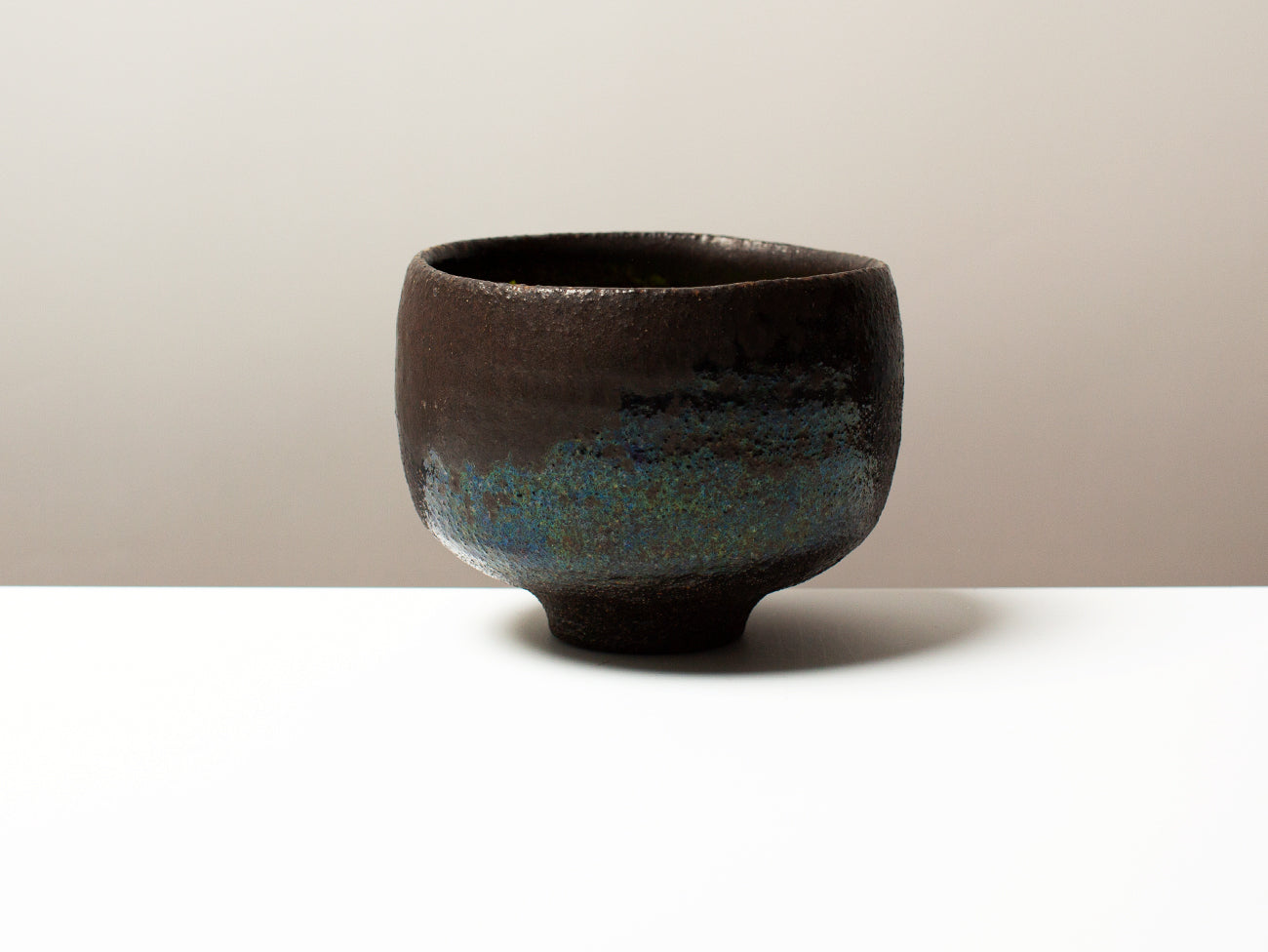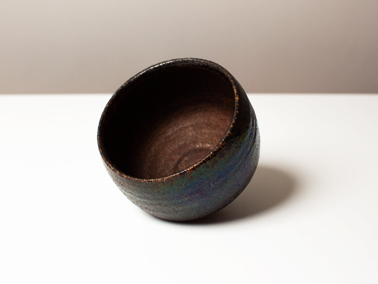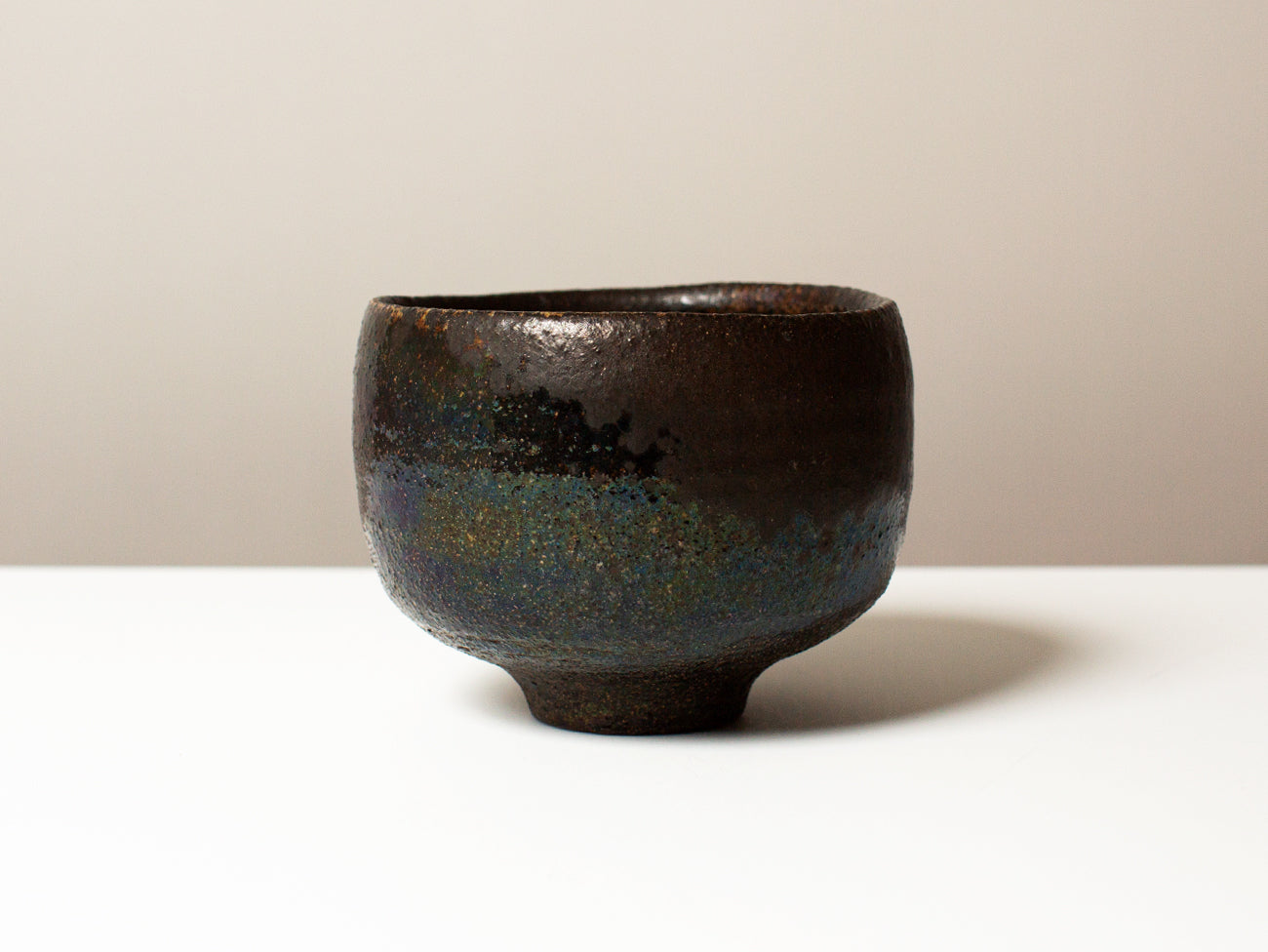 This tea bowl from ceramicist Zhang Yun Cheng is thrown with a textured stoneware and fired in a wood-burning kiln for five days. The atmospheric patterns of ash and carbon as they move through the kiln enhance the rusticity of the bowl’s texture, drawing out grog and flecks of iron oxide in the clay and elevating these tactile elements to the surface of the form. This piece received extra attention from the artist, who pre-seasoned the bowl with tea for over a week, creating a subtle iridescence that will continue to develop with time and use.